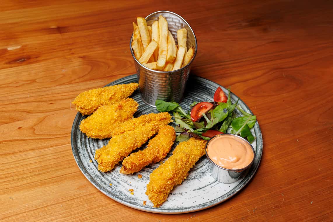 Ingrediente: piept de pui, faina, ou, fulgi de porumb + cartofi prajiti + sos crispy