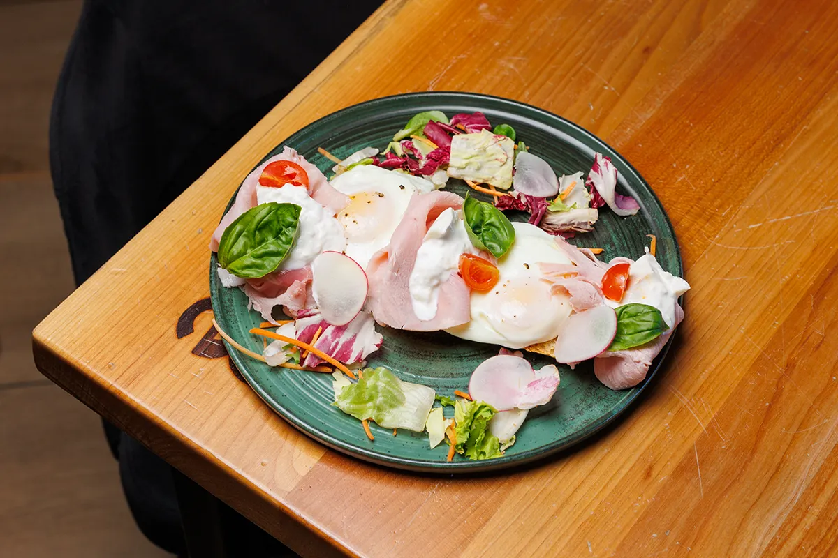 Ingrediente: cruton de paine, prosciutto cotto, doua oua, pesto, burrata, rosii cherry, mix de salata | 400gr